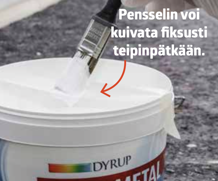 Jos nostat maalia pensselillä suoraan pöntöstä, kiinnitä purkin päälle pätkä maalarinteippiä ja kuivaa pensseli teipin reunaan.
