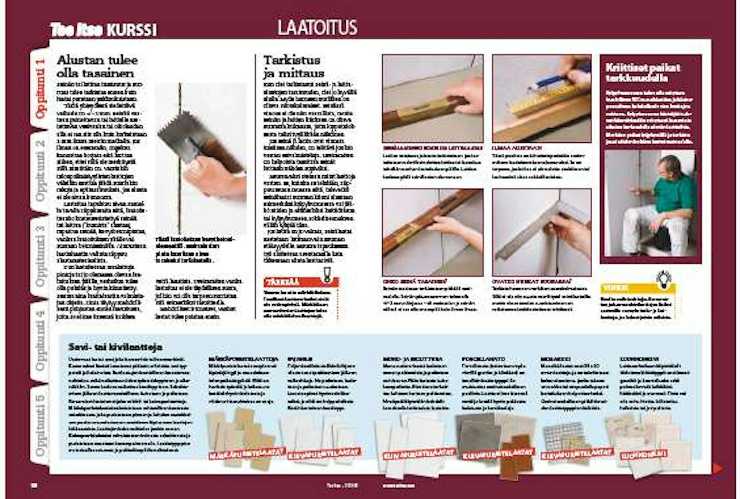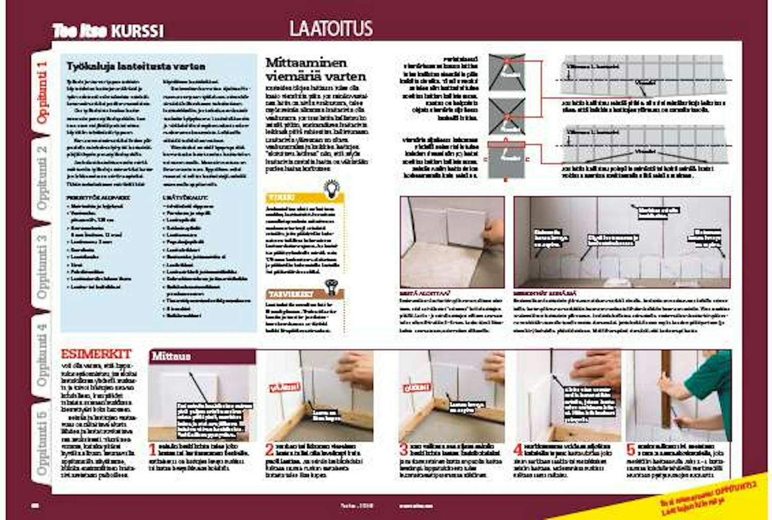 - Osa 1: Laatoita oikein Kuka tahansa saa kiinni-tettyä laatan seinälle. Vaikeus piilee suorien laattarivien toteutta-misessa. Muurarimme näyttää, kuinka seinä- ja lattialaatoitus tehdään.