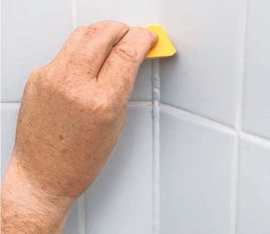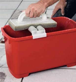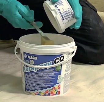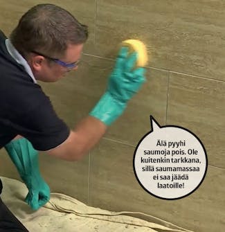 Levitä saumamassa hiertimellä. Paina massa kunnolla kaikkiin saumoihin. Kääntele hierrintä siten, että massaa menee joka paikkaan. Poista ylimääräinen epoksi laattojen päältä vinoilla vedoilla, jotta pois pestävää massaa jää mahdollisimman vähän.