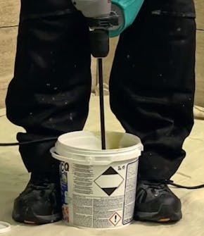 Sekoita massaa 4-5 minuuttia porakoneella ja vispilällä. Aineen koostumus on hieman paksumpi kuin sementtipohjaisen sauma-laastin.