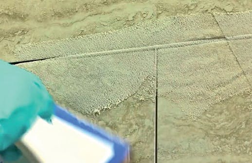 Ota saumalaastia lastalle ja levitä laasti saumojen väliin vetämällä lastaa vinosti laattojen yli. Tarkista, että laasti leviää saumojen pohjaan asti ja täytä mahdolliset kolot. Vedä ylimääräinen laasti pois lastalla ja anna laastin vetäytyä 5-10 minuuttia huoneen lämpötilasta ja kosteudesta riippuen.