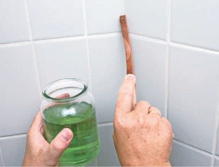 Pese laatat ensimmäisen kerran hyvin lämpimällä vedellä ja kovalla sienellä. Ota toinen astia, täytä se lämpimällä vedellä ja huuhtele sientä välillä. Pese pinta toiseen kertaan pehmeällä sienellä ja lämpimällä vedellä, jossa on spriitä. Huuhtele sientä välillä toisessa paljussa. Hävitä pesuvesi kemikaalijätteenä.