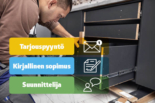 Pyydä aluksi tarjouksia useammasta paikasta ja valitse niistä paras. Kun olette päässeet yhteisymmär rykseen pääasioista, laadi kirjallinen sopimus, jossa sovitaan tarkasti siitä, kuka tekee mitäkin. Kirjatkaa ylös ainakin työn aikataulu, materiaalit, viimeistely ja maksuajat. Se vähentää riitojen mahdollisuutta.