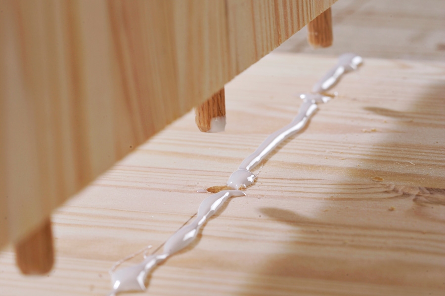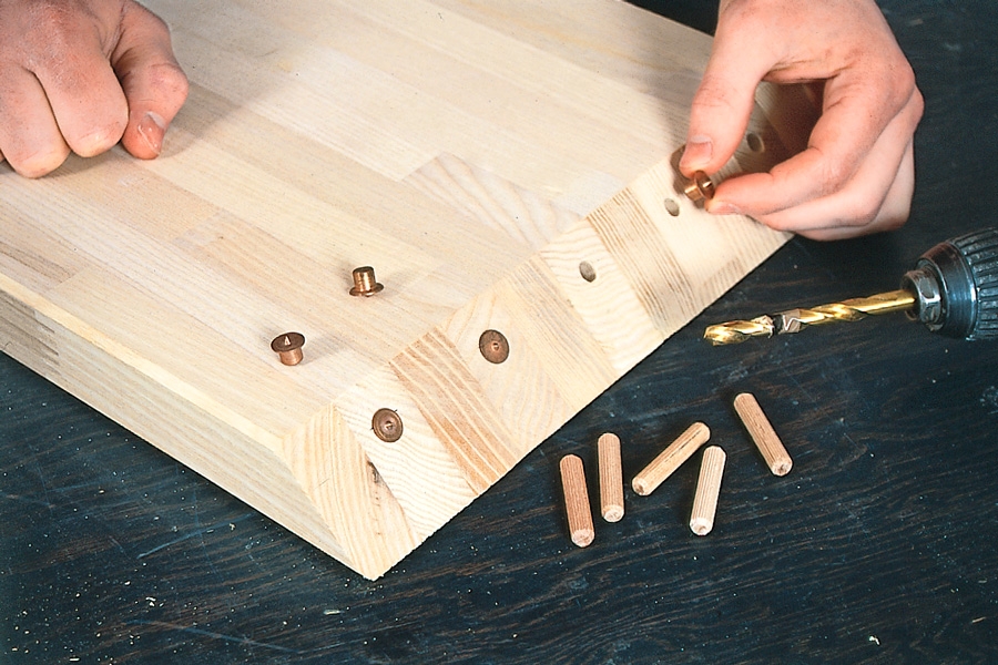 Levitä liimaa reikiin sekä pyörölistasta tehtyihin tappeihin ja lyö tapit pohjaan. Jos tapit tuntuvat tiukoilta, lyö ne pohjaan nopeasti, jotta tapit eivät tartu kiinni liian aikaisin. Anna liiman kuivua.