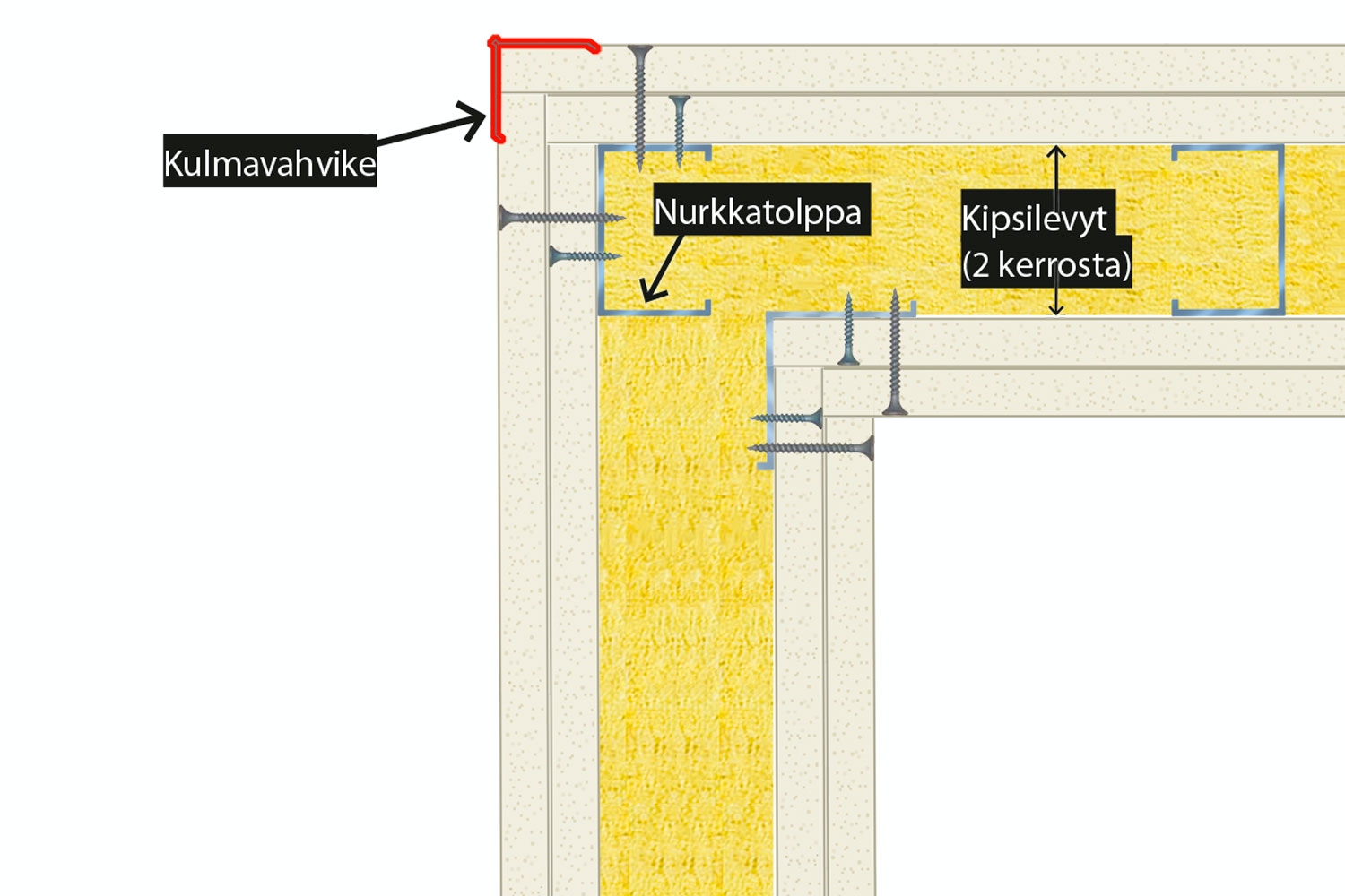 Asenna kipsilevyt vuorotellen nurkan molemmille puolille. Leikkaa levyt siten, että niidet päädyt yltävät viereisen seinän levyn pinnan tasolle.