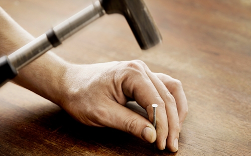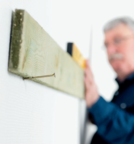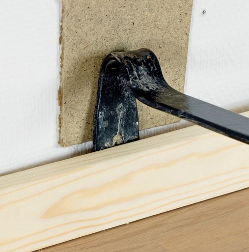Jalkalista voi olla vaikea saada painettua paikalleen vinohkoa lattiapintaa vasten, jos käsissä on samaan aikaan ruuvi, naula tai työkalu. Polven alla olevan laudanpätkän