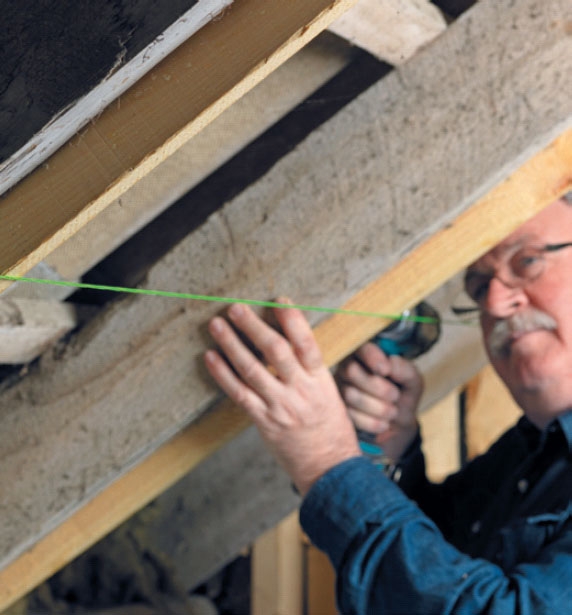 Kun asennat uuden lattian tai katon, palkit ja kannattimet ovat harvoin samassa tasossa. Vanhojen palkkien oikaisemisen sijaan voit asentaa vankoista laudoista oikaisulaudat palkkien tai kannattimien sivuille. Kun oikaiset laudat lattian tai katon kumpaankin päätyyn kiinnitetyn ohjausnarun mukaan, saat rakenteesi alustasta helposti täysin suoran.