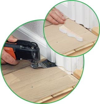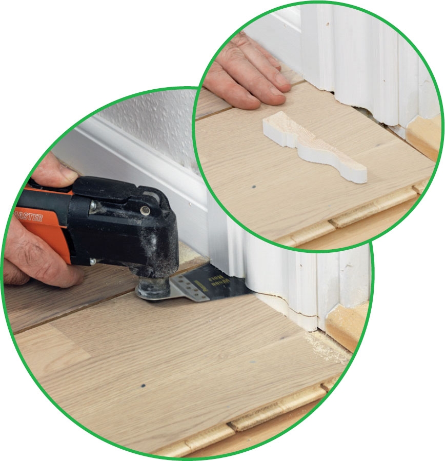 Kelluva lattia, joka on tehty vanhan päälle, on asennettava oven peitelistojen alle. Peitelistoja ei kuitenkaan tarvitse irrottaa, jotta niitä voi lyhentää. Monitoimileikkurilla tai listasahalla, joka on asetettu uuden lattialaminaatin tai -laudan päälle, voi sahata peitelistan sopivaan pituuteen.