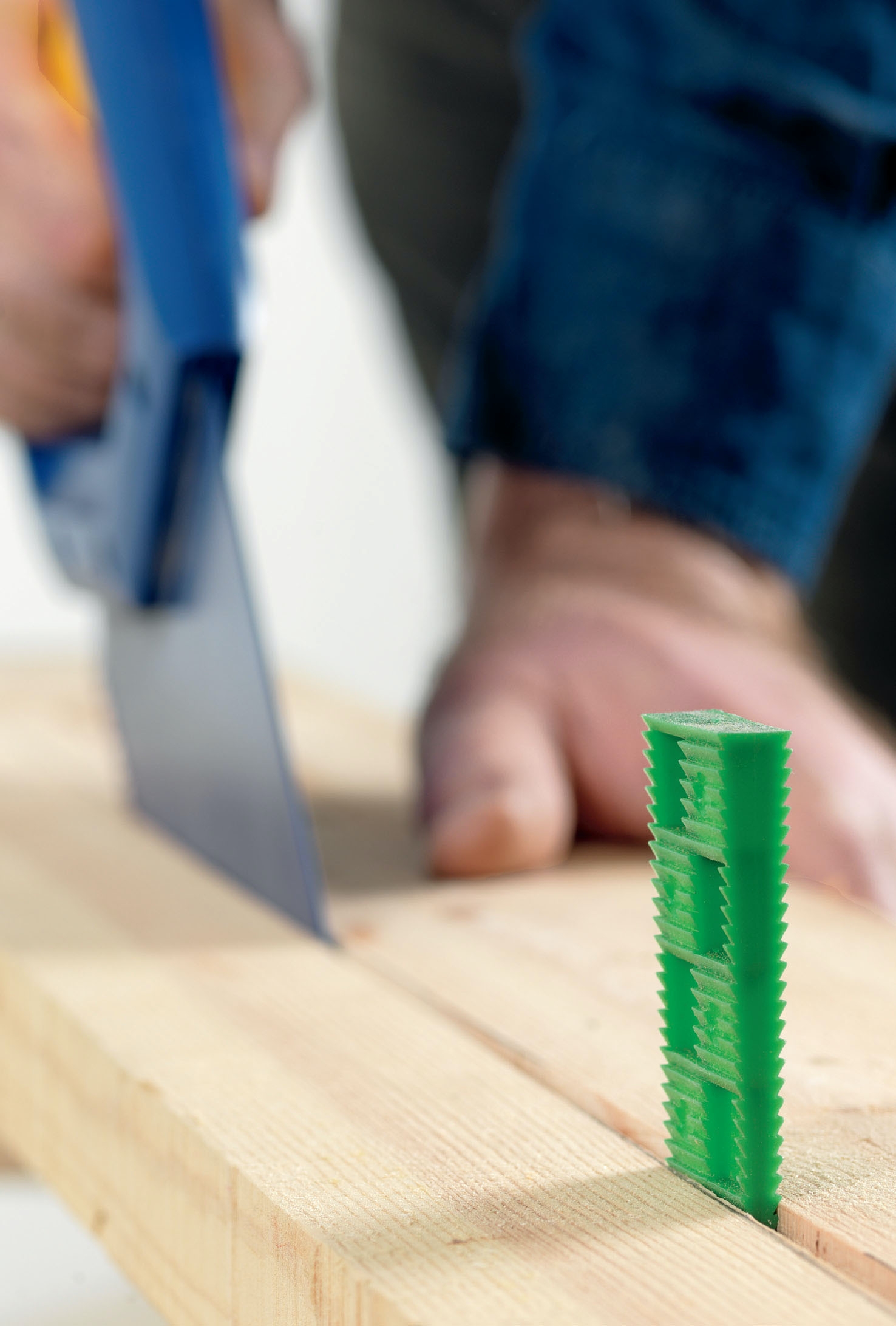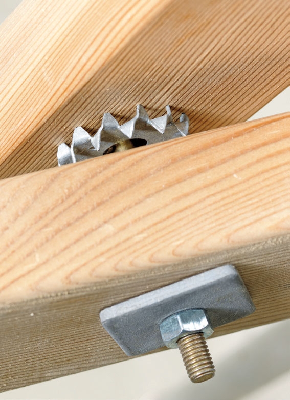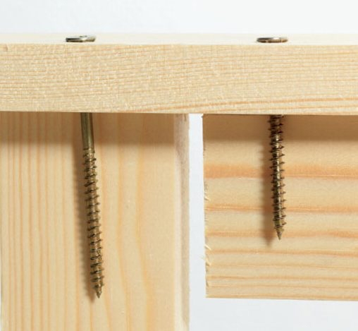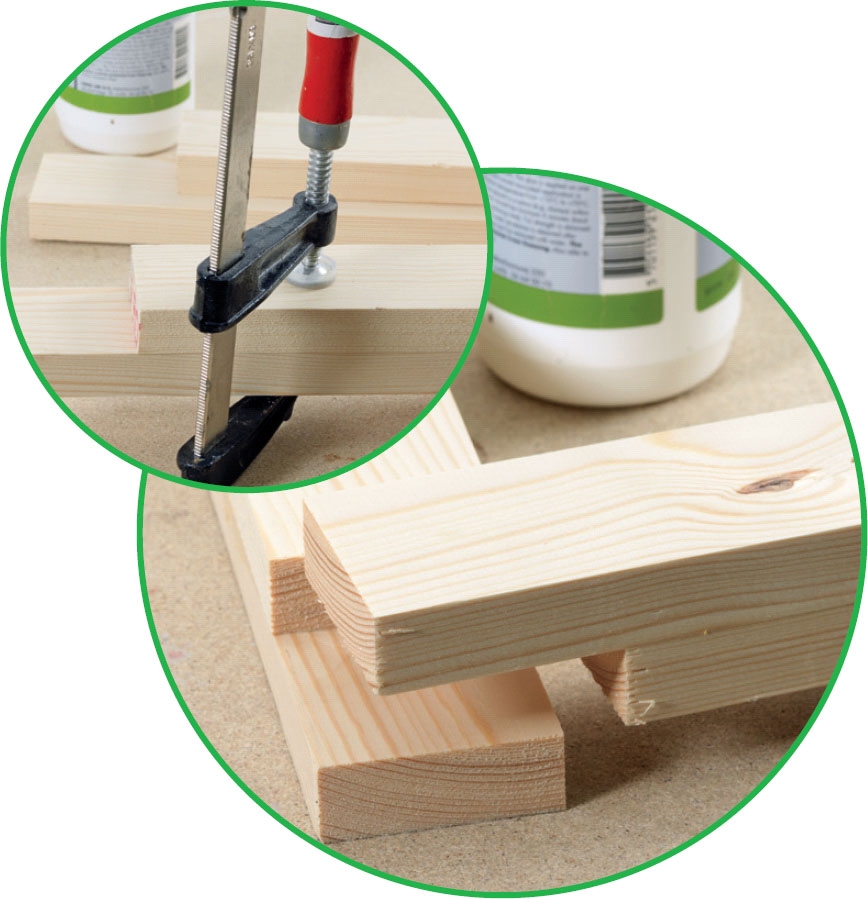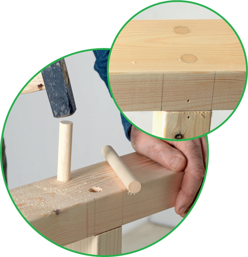 20 cm:n pituisilla itse tehdyillä puutapeilla voi koota järeämpääkin puutavaraa ilman rumia ruuveja ja heloja. Poraa molempien kappaleiden läpi kaksi reikää, sivele puutappeihin pu-liimaa ja iske tapit reikiin.