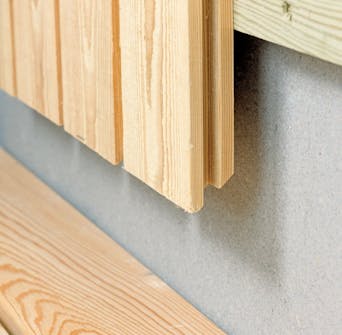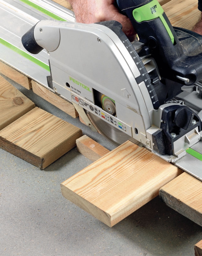 Kun asennat terassilautoja tai päädyn verhoilulautoja, laudat kannattaa jättää alapäistään ylipitkiksi eikä lyhentää niitä vielä. Kun olet asentanut kaikki laudat, voit sahata lautojen päät pyörösahalla ohjainlautaa seuraten yhdellä kertaa. Työ sujuu näppärämmin, ja samalla voit olla varma, että kaikki laudat ovat tarkalleen yhtä pitkiä, jolloin alareunasta tulee varmasti suora