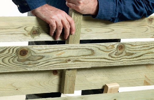 Puupalikkaa käytetään usein raon mittaamiseen, kun asennetaan esim. kattoruoteita tai aitalautoja tasaisin välein. Palikka takaa, että raoista tulee yhtä suuret. Rimat ja laudat eivät kuitenkaan ole aina täysin samanlaisia, joten rako vaihtelee työn edetessä. Merkitse sen sijaan lautojen sijainti pitkään listaan ja siirrä mitta jokaiseen tai joka toiseen pystylinjaan.