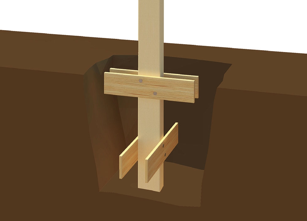 Irtonainen, kevyt ja hiekkainen maaperä ei tue maahan kaivettua tolppaa riittävästi. Jos et halua ryhtyä valamaan, voit vakauttaa tolppaa neljästä painekyllästetystä laudasta tehdyllä ankkurilla. Ruuvaa tai naulaa kaksi lautaa tolpan alareunaan ja toiset kaksi vastakkaissuuntaisesti noin 20 cm:n päähän maanpinnasta. Nyt tolppa seisoo vakaasti ja tukevasti.