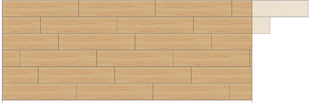 Kun asennetaan lattiaa, päätyliitoksia limitetään vähintään 30 cm:n verran. Jotta limitys näyttäisi luonnolliselta ja hukkapaloja jäisi vähän, seuraava rivi aloitetaan sillä palalla, joka edellisrivin viimeisestä kappaleesta jää yli. Jos kappale ei limitä päätysaumoja riittävästi, voit tehdä kaksi limitystä: Säästä ensimmäisen rivin ylijäämäpala 3. rivin alkuun. Aloita 2. rivi kappaleella, joka limittää päätyliitoksia vähintään 30 cm. 2. rivin ylijäämäpala käytetään 4. rivin alussa jne.