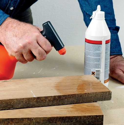 PU-liima kovettuu, kun se joutuu veden kanssa kosketuksiin. Jos puu on hyvin kuivaa, voit edistää kovettumista sivelemällä pintaan hieman vettä ennen kuin liimaat puuosat yhteen.