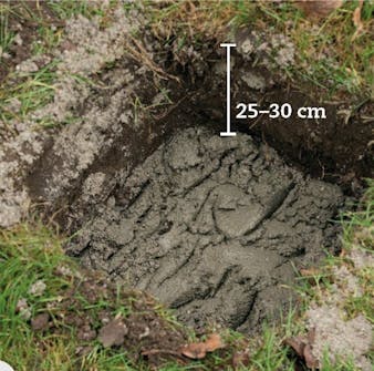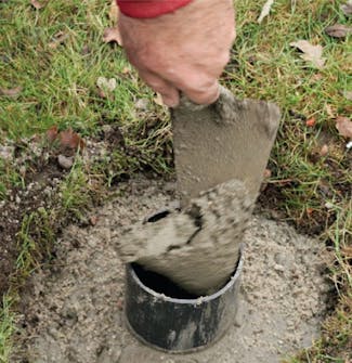 Kaiva roudattomaan syvyyteen ja täytä kuoppa betonilla noin 25-30 cm:n syvyyteen maan pinnasta. Sekoita betoni 1 osasta sementtiä, 3 osasta soraa ja mielellään 3-4 osasta hiekkaa.
