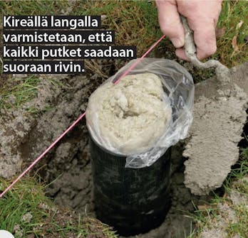 Upota putkea kosteaan betoniin siten, että putken ylälinja on tasan tai hieman yli maan pinnan. Sulje putken suu väliaikaisesti jollakin täytteellä (kuvassa mineraalivillaa sisältävä pussi).