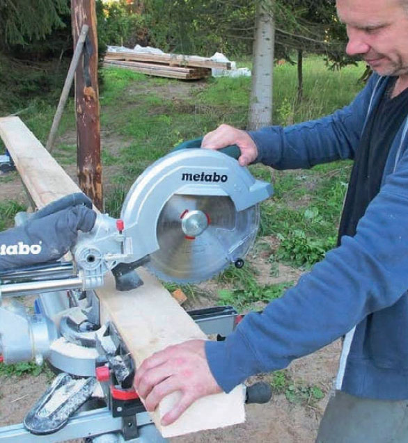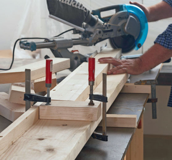 Jos olet sahaamassa paljon samanpituisia lautoja tai rimoja, työssä kannattaa käyttää apuna pituusrajoitinta. Voit tehdä sen puukapulasta ja kahdesta puristimesta. Työnnä vain rima tai lauta kapulaa vasten ja sahaa. Säästät paljon aikaa, kun et joudu mittaamaan jokaista lautaa erikseen.