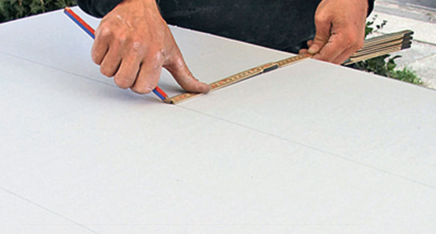 Kaikkien mittojen ei tarvitse olla millintarkkoja. Jos haluat leikata esimerkiksi kipsilevyn kymmenen senttiä leveiksi suikaleiksi, voit säästää aikaa pitämällä lyijykynää mitan päässä ja toista kättä 10 sentin viivan kohdalla levyn reunaa vasten. Sen jälkeen voit vetää lyijykynää ja mittaa levyn päästä päähän ja piirtää viivan levyyn.