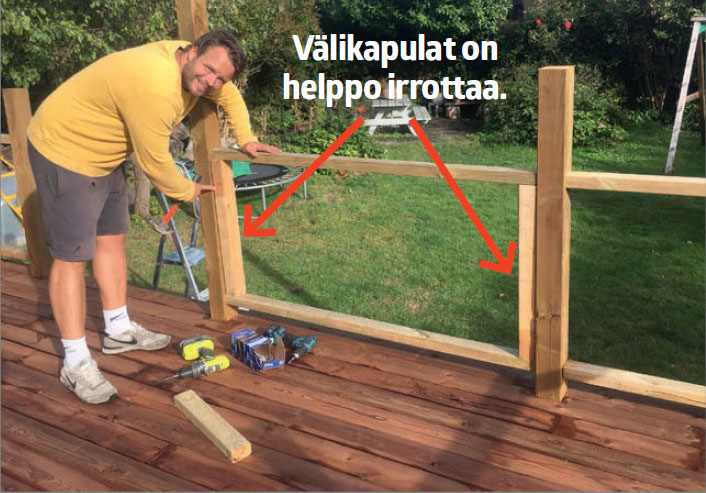 Jos aiot tehdä kaiteen, jokaista laudanväliä ei kannata mitata erikseen. Voit varmistaa parilla välikapulalla, että kaikista raoista tulee yhtä leveät. Välikapuloiden avulla aidasta tulee yhtenäisen näköinen, ja työ sujuu nopeasti.