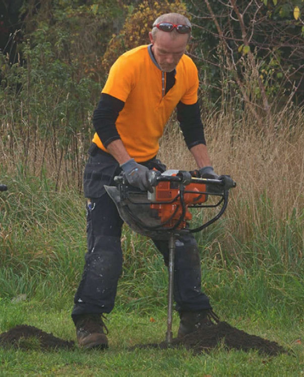 Käsikäyttöinen maakaira on ihan hyvä työkalu 3-4 aidantolpan pystyttämiseen, mutta 15-20 reiän tekemiseen kannattaa vuokrata moottorikäyttöinen maakaira. Sen kanssa tarvitsee vain painaa napista ja pitää kiinni. Sen jälkeen moottori hoitaa loput.