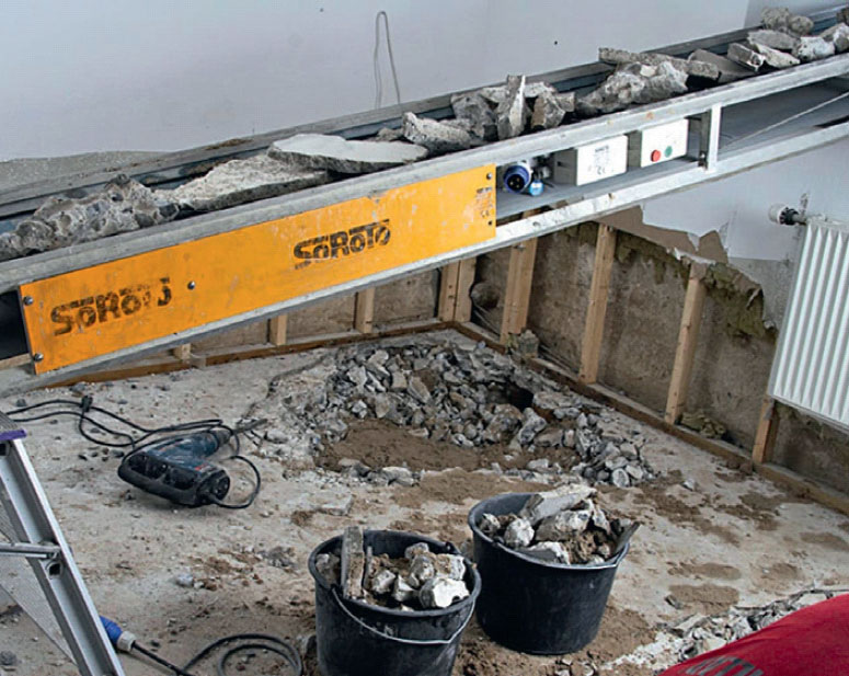 Jos aiot syventää kellaria, voit ostaa 20 ämpäriä ja lappaa maan ja betonin ulos käsipelillä. Toinen ja parempi vaihtoehto on vuokrata hihnakuljetin ja antaa sen kuljettaa ylimääräinen maa ulos kellarin ikkunasta. Pisimmät hihnakuljettimet ovat 8 metriä pitkiä, ja jos yksi kuljetin ei yllä vaihtolavalle asti, voit pystyttää hihnan jatkoksi toisen samanlaisen.