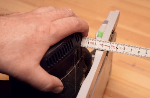Mittaa korkeus pohjalevystä sahan mahdolliseen ulokekohtaan. Reuna-lista ei saa olla niin korkea, että sahan uloke jää jumiin, kun saha painetaan kokonaan alas. Kuvassa listan korkeudeksi tulee 3 cm.