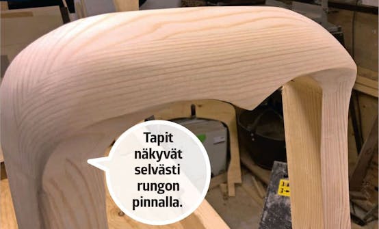 Thomas liitti korin puuosat yhteen tapeilla. Hän päätti käyttää tappeja siksi, että tappiliitokset ovat tarpeeksi kestäviä ja liitokset jäävät näkyviin sen jälkeen, kun osat on hiottu valmiiksi.