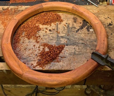 Aluksi Thomas teki kahdeksan kulmaisen kehikon padaukpuusta yhdistämällä osat lapaliitoksilla ja liimalla. Puun syyt osoittavat samaan suuntaan joka osassa. Se tekee ratista hyvän näköisen ja varmistaa, että se kestää.