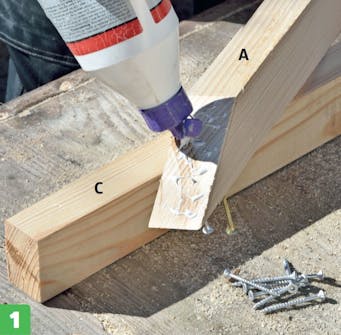 Kokoa kattotuolit liimalla ja ruuveilla. Aloita yläpaarteesta (A) ja levitä liimaa vinoon päähän, ennen kuin ruuvaat sen kiinni alapaarteeseen (C).